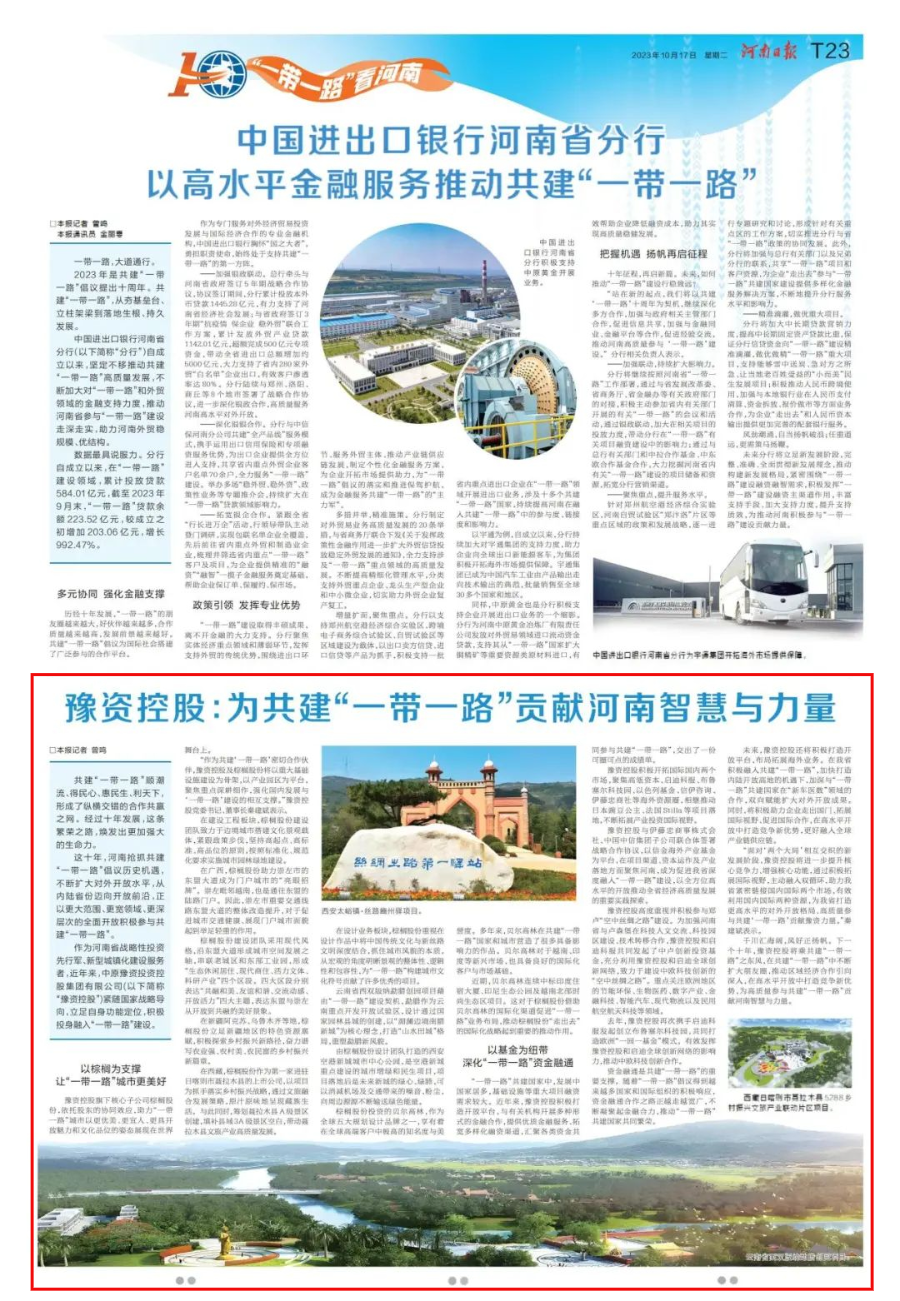 河南日?qǐng)?bào)發(fā)表“一帶一路看河南”專版文章——豫資控股:為共建一帶一路”貢獻(xiàn)河南智慧與力量2023.10.17